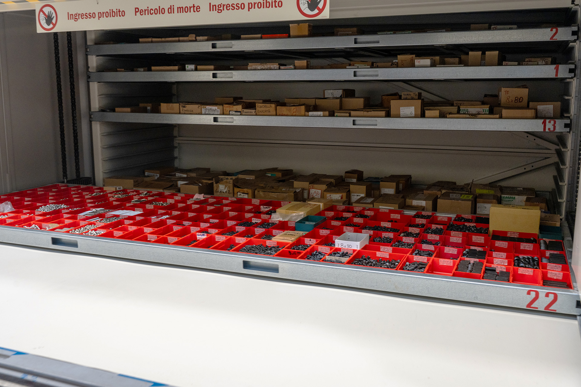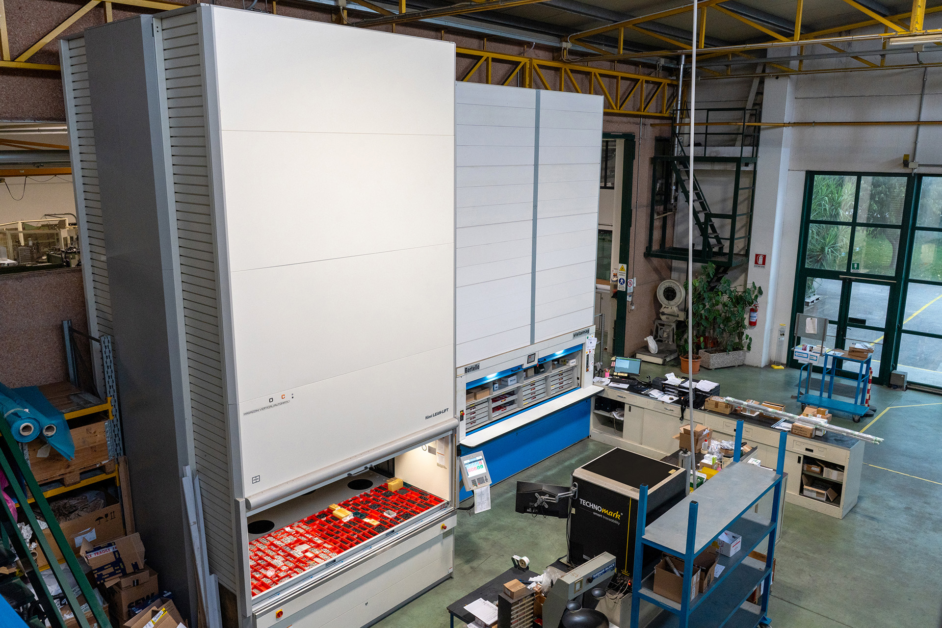 Magazzino verticale rotante Bertello computerizzato MODULA LIFT doppia baia esterna misure L 4520 P 2600 H 8700 a 24 cassetti con portata da 110 Kg cadauno.
